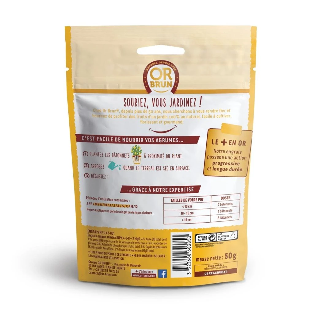 L’engrais en bâtonnets Agrumes et Plantes méditerranéennes Or Brun, à planter dans le substrat des plantes cultivées en pots ou en bacs, facilite la vie du jardinier. De nature organo-minérale, il diffuse progressivement pendant environ un mois tous les nutriments nécessaires à une croissance vigoureuse, une floraison généreuse et une fructification abondante de toutes les variétés d’agrumes (orangers, citronniers, mandariniers, kumquat, limettier etc…) et autres plantes exotiques. Utilisable en agriculture biologique, ce fertilisant est conditionné en sachet refermable contenant 25 petits bâtonnets.