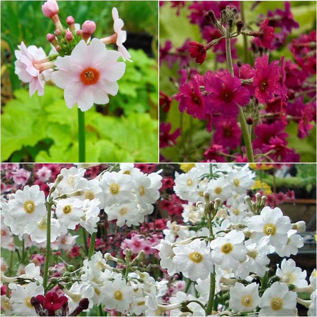 2 Japonica Apple Blossom : une primevère étagée de couleur rose tendre, 2 Japonica Alba de couleur blanche 2 Pulverulenta de couleur pourpre carmin