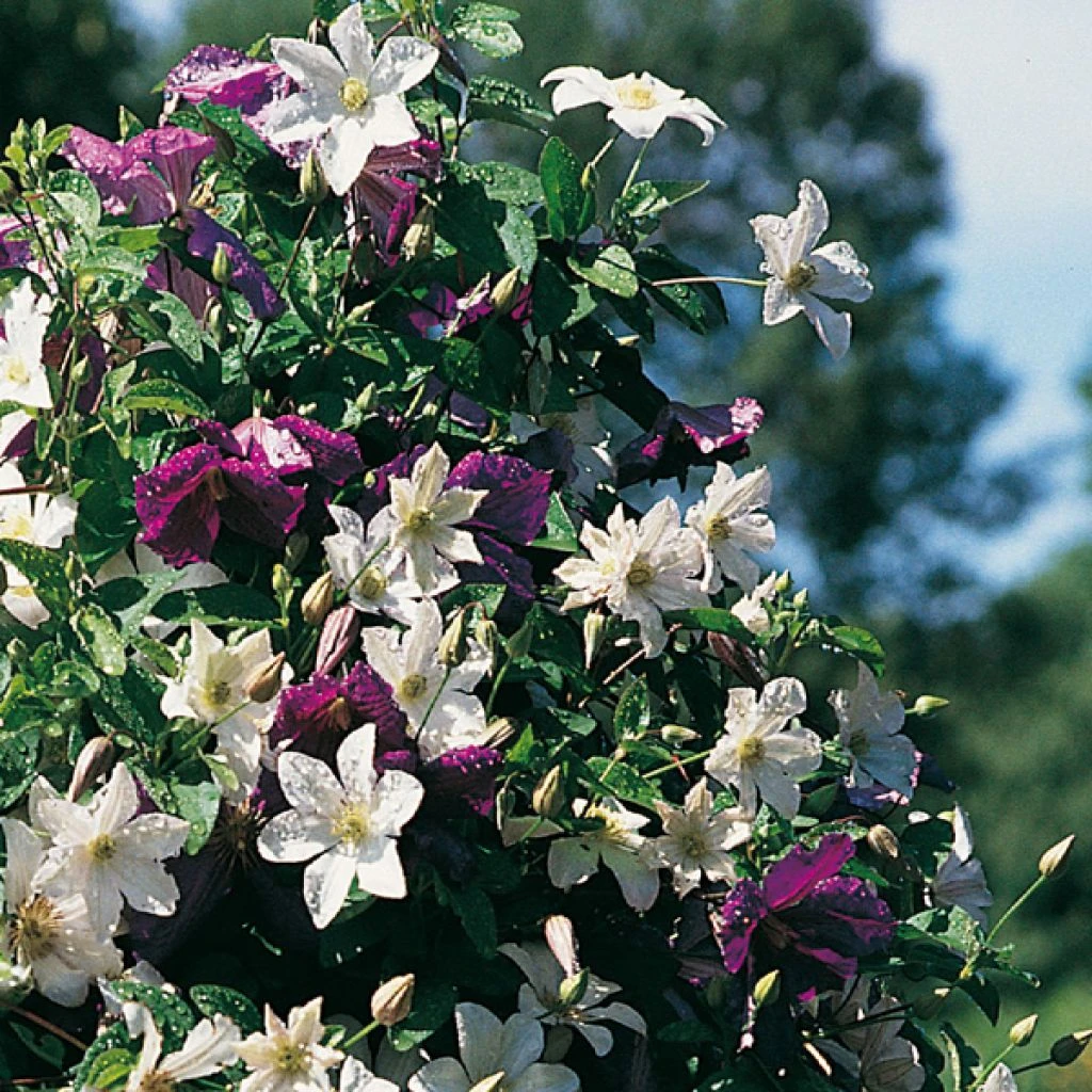 2 Clématites :1 rouge 1 blanche, 2 jolies variétés pour un contraste de forme et de couleur. 2 plantes dénommées et étiquetées.