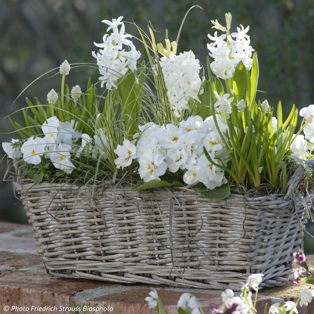 Cette collection ‘Printemps parfumé – Jardinière Blanche’ réunit des plantes bulbeuses et des bisannuelles soigneusement choisies pour leurs floraisons blanches et parfumées, accompagnées d’un lumineux Carex à feuillage panaché. Installées dans une grande jardinière ou même dans un petit massif non loin de la maison, elles offriront un décor embaumé et très fleuri de février à mai, et rehaussé par la persistance élégante du Carex en toute saison.