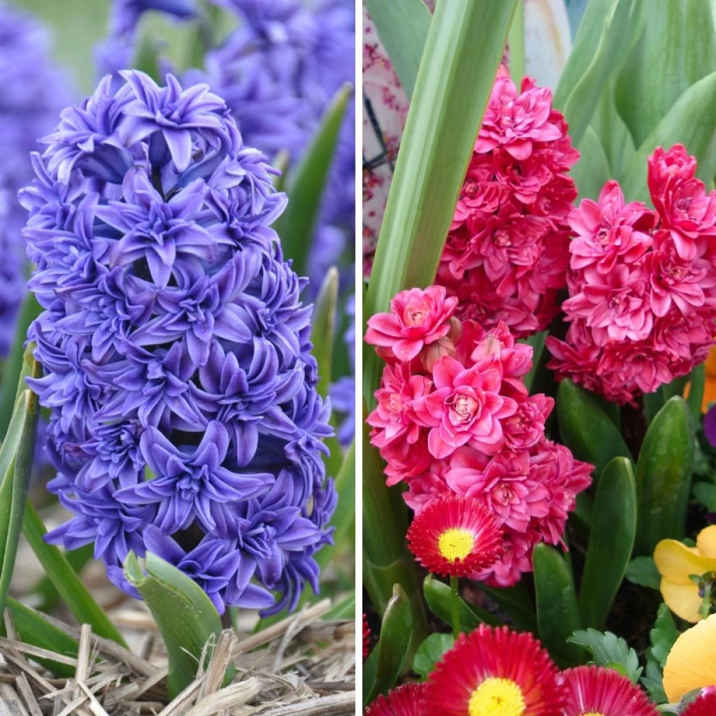 La collection « Duo Jacinthes doubles » met en avant les variĂ©tĂ©s ‘Crystal Palace’ et ‘Hollyhock’, deux merveilles horticoles aux fleurs aussi somptueuses que parfumĂ©es. Ces bulbes produisent des Ă©pis floraux gĂ©nĂ©reux dès le dĂ©but du printemps. Plantez-les Ă l’automne en bordure de massif, le long d’une allĂ©e ou dans une jardinière. Culture en plein soleil ou Ă mi-ombre dans un sol bien drainĂ© et riche en humus, mĂŞme sec en Ă©tĂ©.