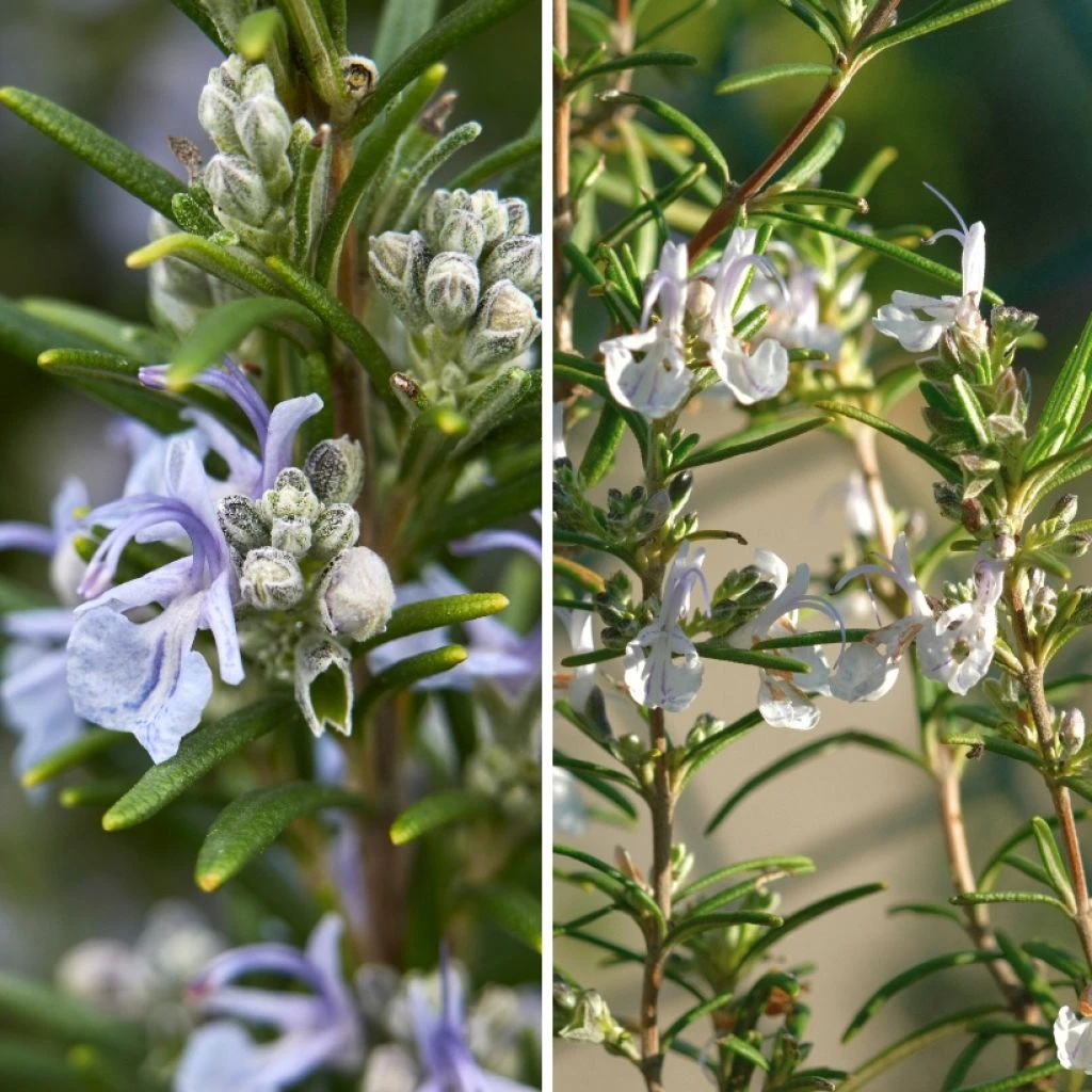 Le Duo Romarins bleu et blanc se compose de deux variétés de romarins différentes (Rosmarinus officinalis) qui animeront votre jardin ou votre terrasse avec leur feuillage persistant aromatique et leurs petites fleurs mellifères. Ces plantes vivaces arbustives, connues pour leur robustesse et leur résistance à la sécheresse, fleurissent au printemps et en été, ou au printemps et en automne sous les climats méditerranéens. Elles exigent un sol bien drainé et une exposition en plein soleil. Vous utiliserez leur feuillage pour parfumer vos grillades et toute la cuisine méditerranéenne.