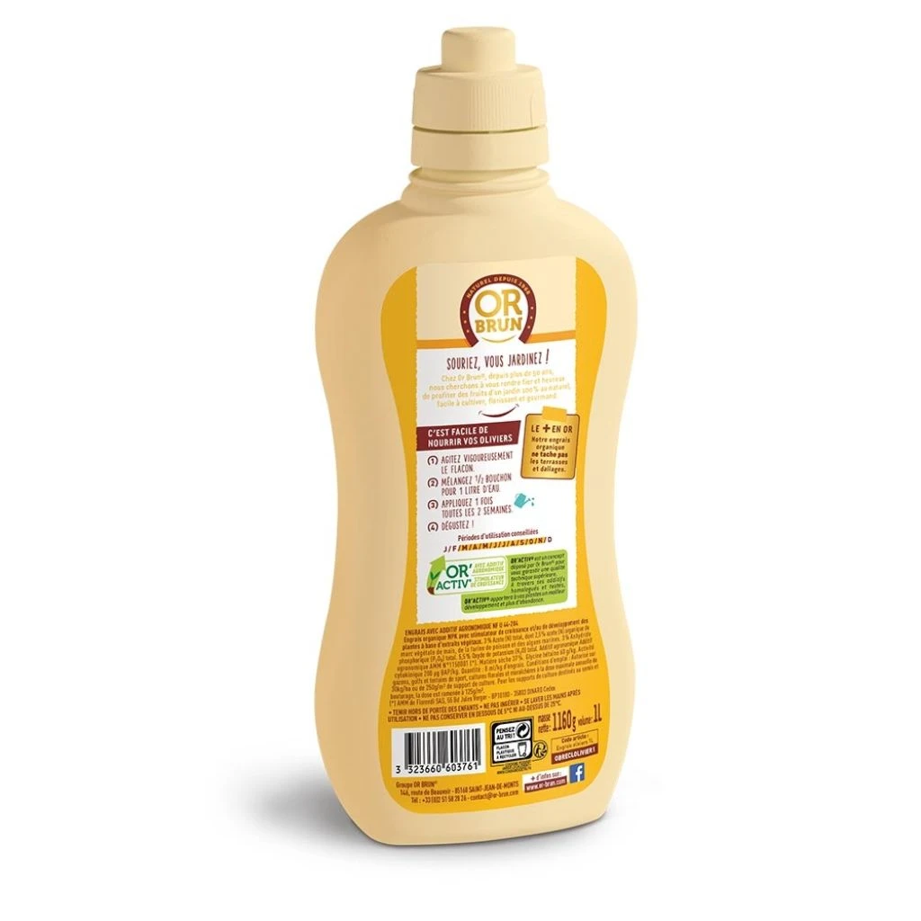L’engrais liquide Oliviers Or Brun est un fertilisant organique haut de gamme, qui nourrit en profondeur toutes les variétés d’oliviers, qu’ils soient cultivés en bac, en pot ou en pleine terre. Il stimule la croissance et le développement du feuillage jusqu’aux racines par sa formule Or’activ, évite les carences et permet des récoltes plus abondantes. Conditionné en bidon de 1 litre avec bouchon doseur-verseur sécurité enfant, il permet de préparer jusqu’à 100 litres de solution nutritive. C’est un produit utilisable en Agriculture Biologique.