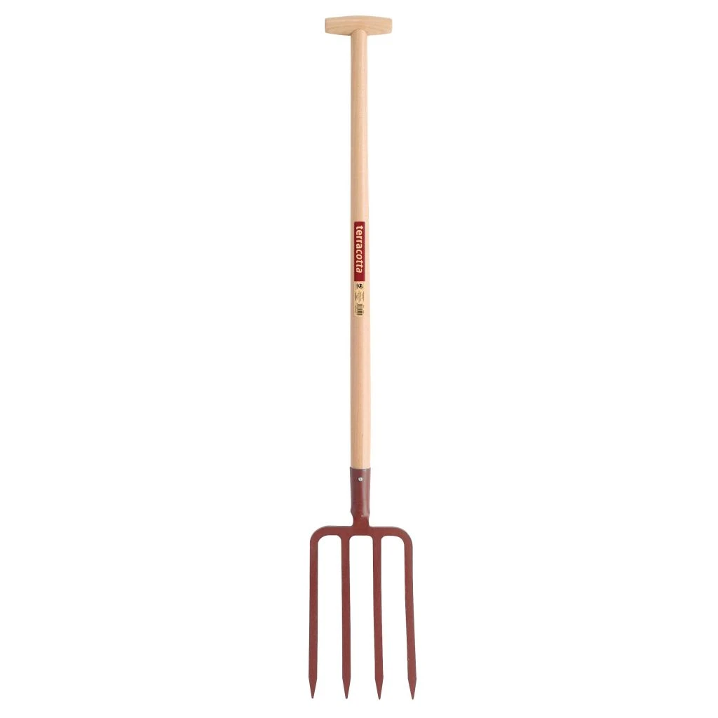 L’utilisateur posera le pied sur la tête de l’outil pour enfoncer les dents dans la terre. Le manche terminé en béquille offre un deuxième point d’appui qui permet au jardinier d’utiliser son poids pour enfoncer plus facilement les dents dans le sol.