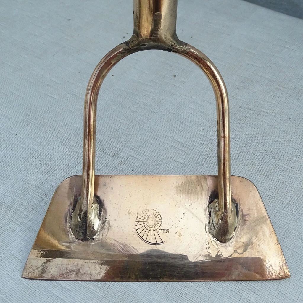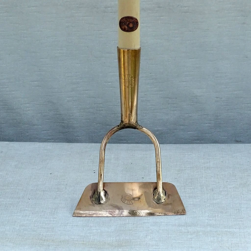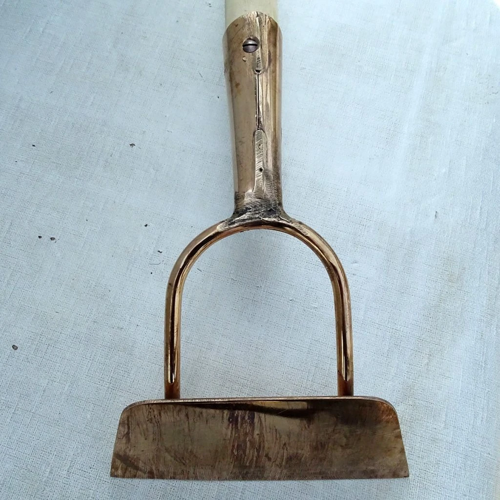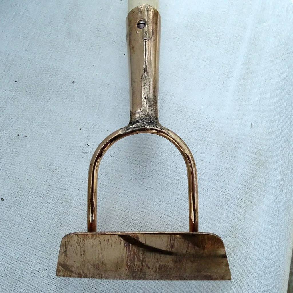 Pour conserver le bel aspect de votre outil en cuivre, nous vous conseillons de le nettoyer avec une brosse dure après chaque usage, de le stocker à l’abri de l’humidité et une fois par an de passer le manche au papier de verre fin puis de l’huiler avec un mélange d’huile de lin et de térébenthine qui permet une application plus facile. Vous pouvez diluer moitié moitié et pour un séchage plus rapide du manche utiliser l’huile de lin cuite.