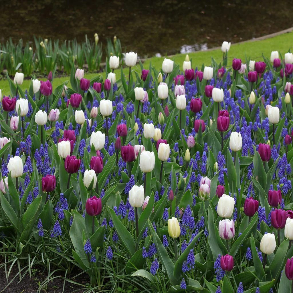 Nous vous proposons cette Inspiration bulbes de printemps Crépuscule qui vous permettra de réaliser facilement une scène printanière élégante, dans des tons blancs, pourpres, mauves et violets. Elle marie pour le meilleur trois variétés de tulipes différentes au muscari armeniacum, connu pour ses petites grappes violacées bien parfumées. Entre avril et mai, toutes ces fleurs composent un décor magnifiquement fleuri. Vous planterez les bulbes dans un massif de vivaces ou dans une grande bordure.