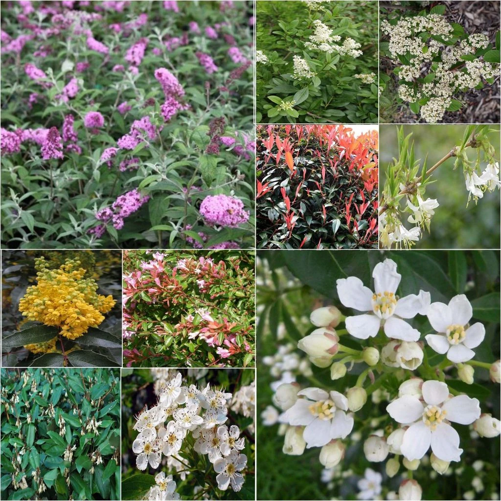 – 1 Photinia Red Robin : persistant, en moyenne 3 m de hauteur pour 2 m d’envergure sans taille, il se distingue par ses jeunes pousses et jeunes feuilles rouges, contrastant avec son feuillage mature d’un vert foncé luisant. Floraison printanière (de mars à mai selon les régions), en bouquets de petites fleurs d’un blanc un peu incertain, odorantes et mellifères. Son feuillage persiste en hiver.