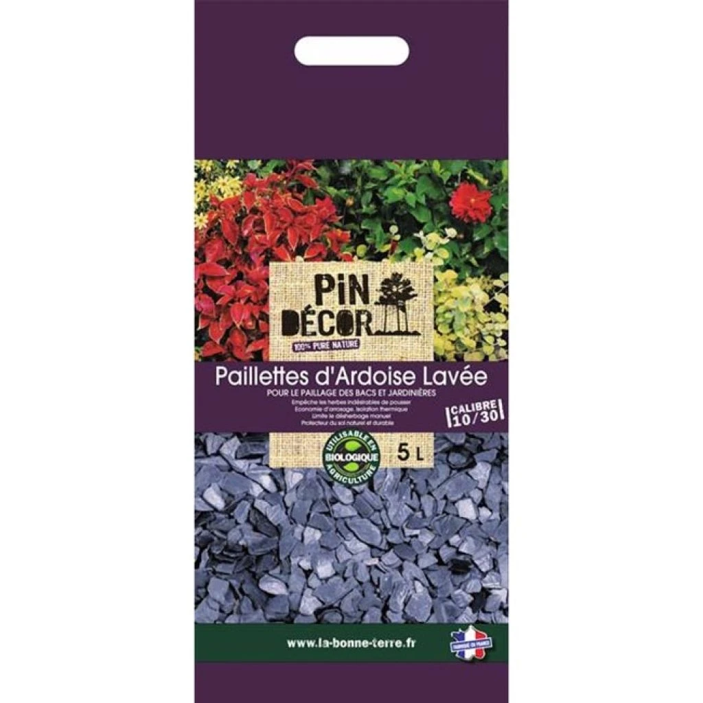 Les paillettes d’ardoise, substrat minéral étalé à même le sol bien désherbé, constituent un paillage à la fois esthétique, protecteur, très durable et sans entretien. Elles permettent d’éviter la pousse des mauvaises herbes et l’utilisation de désherbants chimiques, limitent les phénomènes d’évaporation de l’eau contenue dans le sol, et isolent le pied des plantes du gel. En dehors de cet aspect utilitaire de paillage, elles décorent les espaces naturels : jardin, terrasse, massif, allées, pied des arbres, jardin japonais, bassin, patio…, selon votre inspiration. Proposé en sac de 5 litres avec poigné, ce paillis est facile à transporter et particulièrement adapté à la décoration des jardinières. Un sac permet de couvrir 0.25 m² sur 2 cm d’épaisseur.