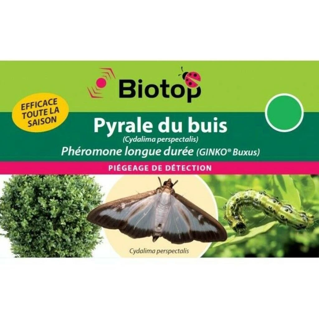 Les phéromones Pyrale du buis Biotop font partie d’un dispositif de lutte biologique contre ce ravageur qui évite au jardinier d’avoir recours à la pulvérisation ou à l’utilisation de pesticides. Le piégeage limite la prolifération des ravageurs et permet de détecter leur présence, conduisant à la mise en place de méthodes de lutte complémentaires si nécessaire. Une capsule longue durée Ginko Buxus suffit pour couvrir toute la période à risque, d’avril à octobre.
