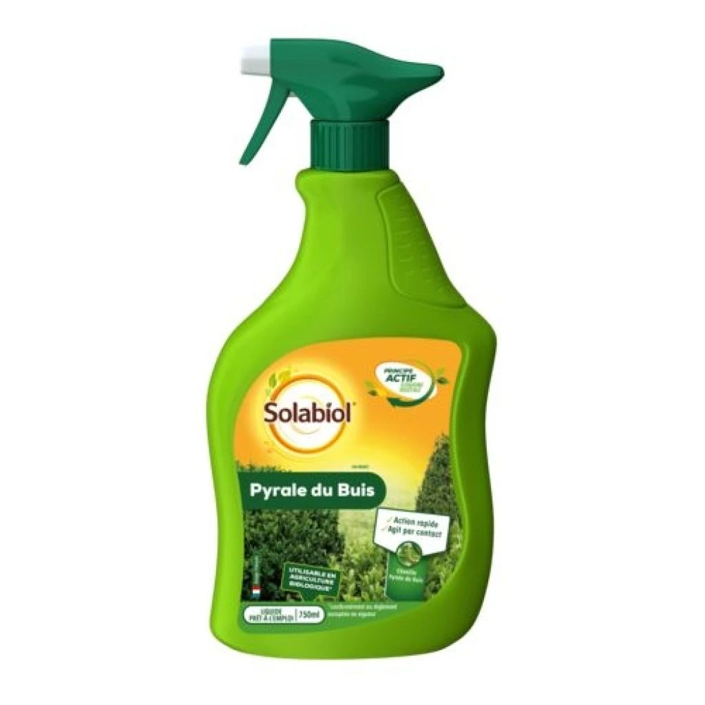 Pyrale du buis prêt à l’emploi Solabiol est un traitement qui permet de lutter efficacement de manière curative contre la chenille de la pyrale du buis qui ravage ces arbustes depuis quelques années en France. C’est un produit à base de pyréthrines d’origine végétale et d’abamectine qui agit par contact et ingestion et possède une action choc. Il est conditionné en pulvérisateur 750 ml. Utilisable en agriculture biologique.