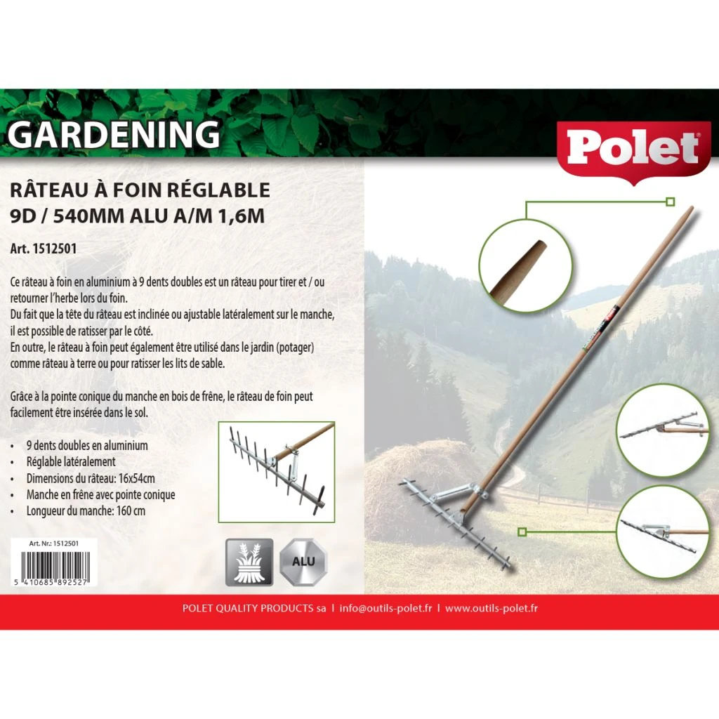 Ce râteau à foin réglable 9D/540 mm Polet, équipé d’un solide manche en frêne, est un outil conçu pour les jardiniers amateurs qui souhaitent faire leur foin eux-mêmes. Sa tête munie de 9 dents en aluminium est inclinable grâce à une fixation sur le manche. Maintenue oblique, cette tête ramasse les foins en andains, dans un mouvement latéral, comme pour le fauchage. Il est possible de ratisser avec le côté de la tête dans les endroits exigus. Enfin, on peut utiliser cet outil comme un râteau classique, pour affiner la terre du potager ou étaler du sable. Le manche en bois de frêne présente une extrémité conique, ce qui permet à l’utilisateur de le planter dans le sol pour se reposer.
